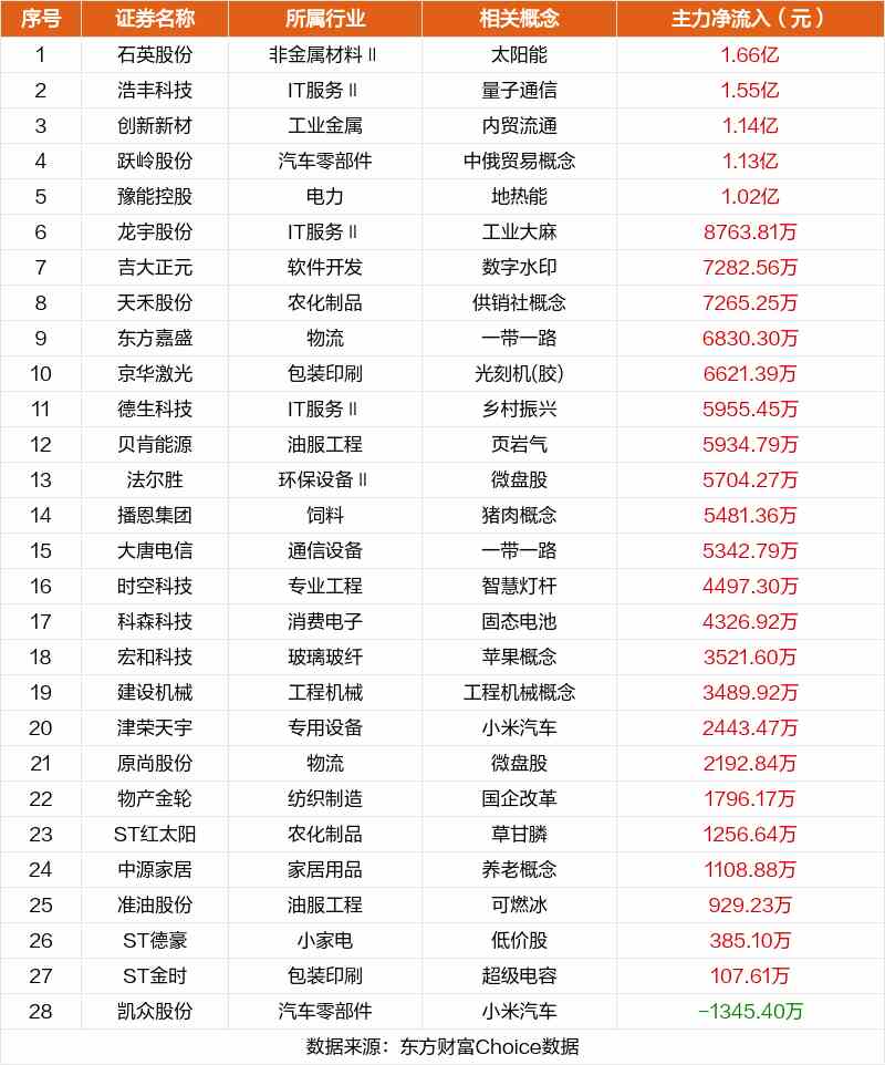 非連板個股方面,石英股份、浩豐科技、創(chuàng)新新材主力資金凈流入居前。