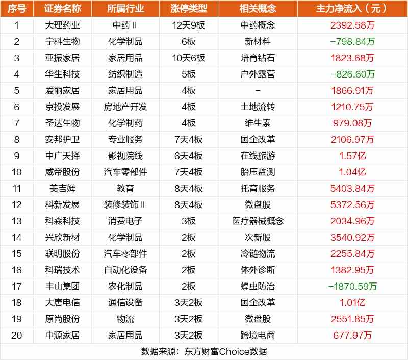其中,中藥概念大理藥業(yè)12天9板,新材料寧科生物6板,培育鉆石亞振家居10天6板。