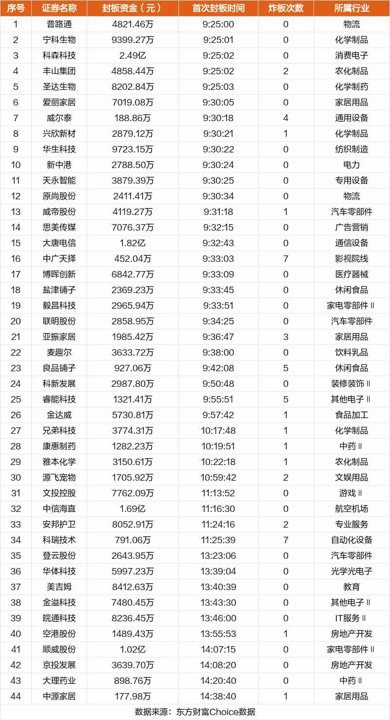 從首次封板時(shí)間角度看,今日44只非ST股中,愛(ài)麗家居、威爾泰、興欣新材等在開(kāi)盤(pán)5分鐘內(nèi)首次觸板。