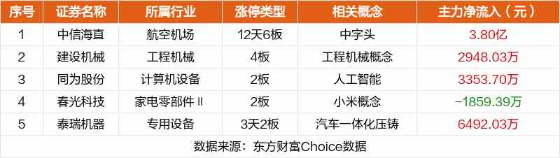 其中,中字頭中信海直12天6板,工程機械概念建設機械4板,人工智能同為股份2板。