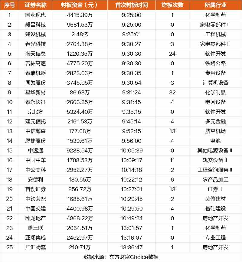 從首次封板時間角度看,今日25只非ST股中,春光科技、南天信息、吉林高速等在開盤5分鐘內(nèi)首次觸板。