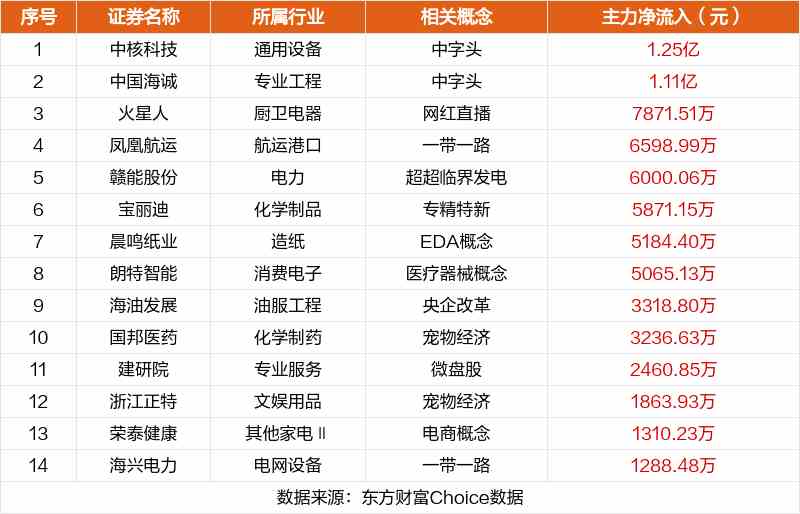 非連板個(gè)股方面,中核科技、中國(guó)海誠(chéng)、火星人主力資金凈流入居前。
