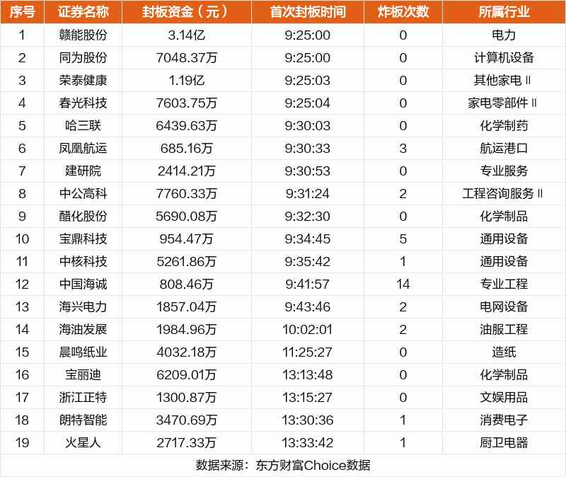 從首次封板時(shí)間角度看,今日19只非ST股中,哈三聯(lián)、鳳凰航運(yùn)、建研院等在開(kāi)盤(pán)5分鐘內(nèi)首次觸板。