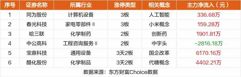 其中,人工智能同為股份3板,小米概念春光科技3板,創(chuàng)新藥哈三聯(lián)2板。