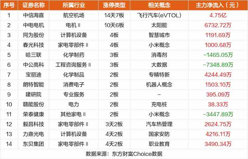 其中,飛行汽車(eVTOL)中信海直14天7板,太陽能中電電機10天6板,智慧城市同為股份4板。