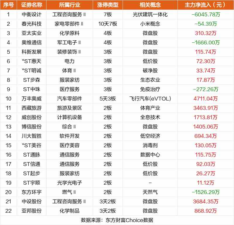 其中,光伏建筑一體化中衡設(shè)計7板,小米概念春光科技10天7板,微盤股亞太實業(yè)4板。