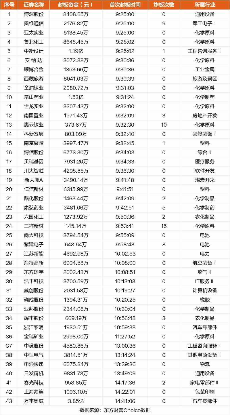 從首次封板時間角度看,今日43只非ST股中,安納達(dá)、順博合金、西藏旅游等在開盤5分鐘內(nèi)首次觸板。