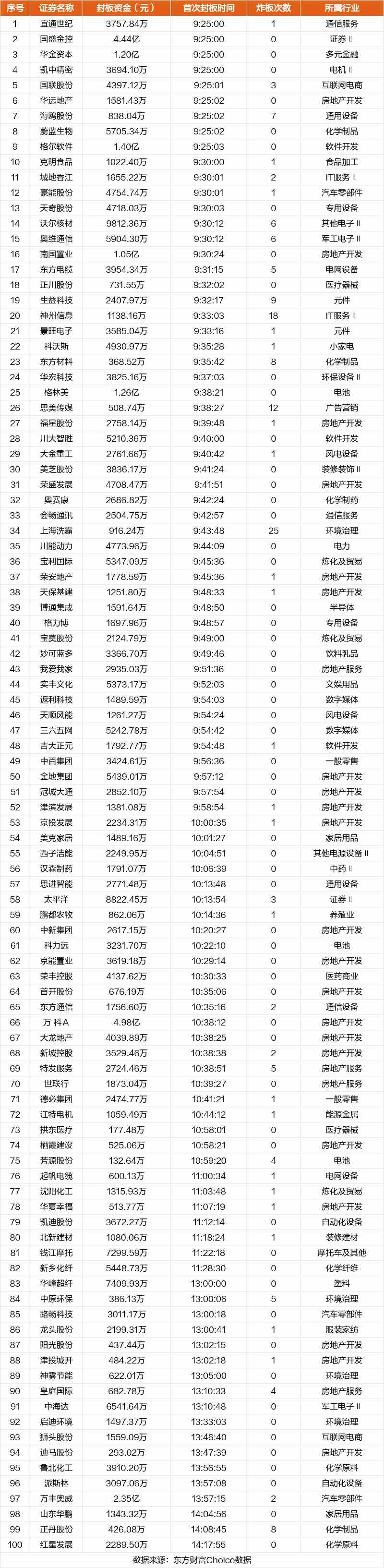 從首次封板時(shí)間角度看,今日111只非ST股中,克明食品、豪能股份、城地香江等在開(kāi)盤5分鐘內(nèi)首次觸板。