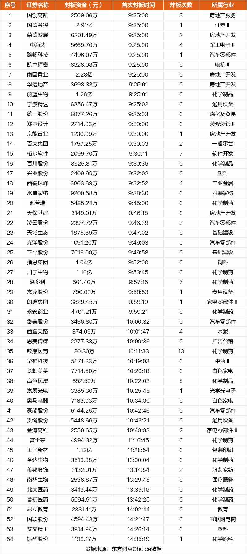 從首次封板時間角度看,今日54只非ST股中,鄭中設計、京能置業(yè)、百大集團等在開盤5分鐘內(nèi)首次觸板。