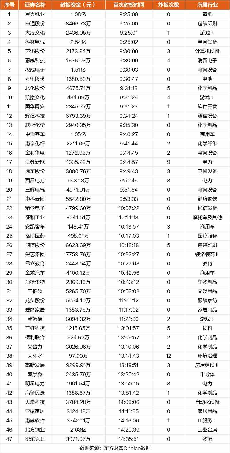 從首次封板時(shí)間角度看,今日47只非ST股中,聲迅股份、惠威科技、積成電子等在開盤5分鐘內(nèi)首次觸板。