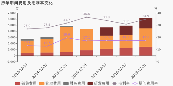 公司2019年營業(yè)成本2.3億,同比增長17.5%,低于營業(yè)收入24.9%的增速,導(dǎo)致毛利率上升4.1%。期間費用率為17.5%,同去年相比變化不大。經(jīng)營性現(xiàn)金流大幅上升133.5%至5149.1萬。公司本期研發(fā)投入為1674.2萬,同比上升12.2%。研發(fā)投入全部費用化,不作資本化處理。