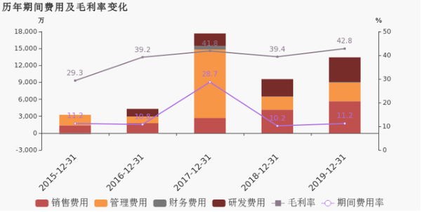 公司2019年營業(yè)成本6.8億,同比增長20.1%,低于營業(yè)收入27%的增速,導致毛利率上升3.3%。期間費用率為11.2%,較上年升高1.1%。公司研發(fā)投入大幅增加,相比去年同期增長43.4%達到4389.8萬。