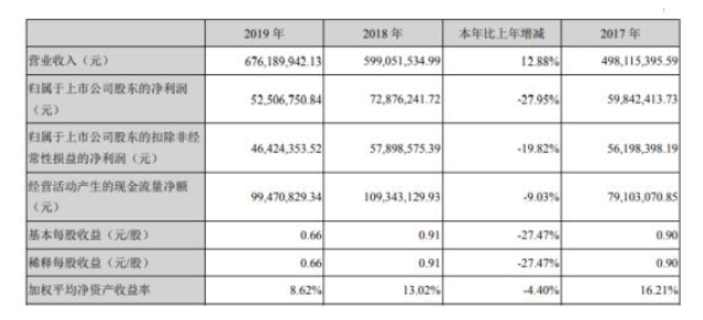 中大力德(002896)近日發(fā)布2019年年度報(bào)告,公告顯示,報(bào)告期內(nèi)實(shí)現(xiàn)營(yíng)收676,189,942.13元,同比增長(zhǎng)12.88%;歸屬于上市公司股東的凈利潤(rùn)52,506,750.84元,同比下滑27.95%;基本每股收益為0.66元,上年同期為0.91元。