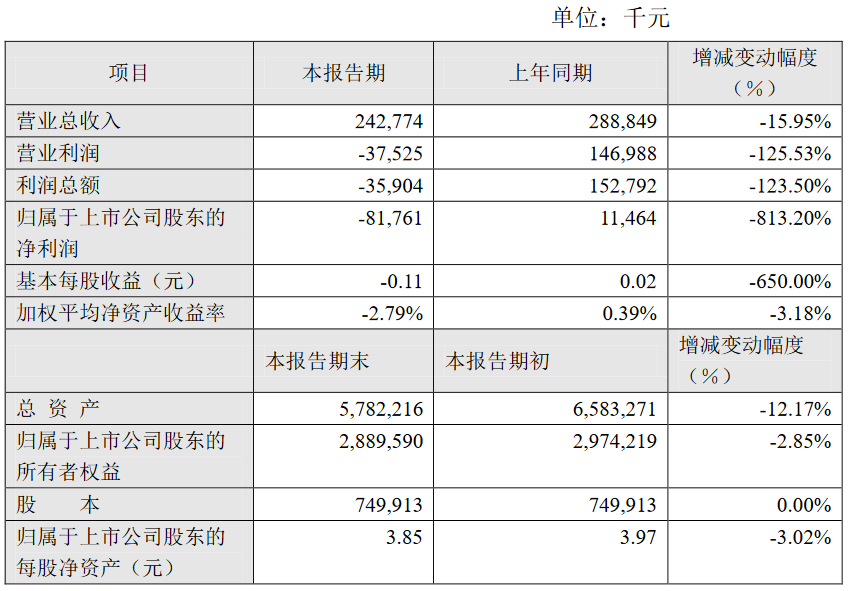 2019 年公司實(shí)現(xiàn)營(yíng)業(yè)收入2.43億元,較上年同期減少15.95%,歸屬于上市公司股東的凈利潤(rùn)-8176.1萬(wàn)元,較上年同期減少813.20%。