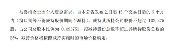 據(jù)了解,董事馬喜梅持有本公司股份409,500股,占公司總股本比例為0.375%。本次擬減持的原因系個人資金需求,股份來源為IPO前取得及其他方式取得。