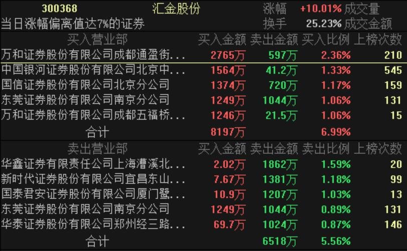匯金股份(300368)周一大幅波動(dòng),早盤一度跌逾9%,而收盤以漲停報(bào)收,全天震幅近20%,這也是匯金股份連續(xù)第4個(gè)漲停。龍虎榜數(shù)據(jù)顯示,買一萬(wàn)和證券成都通盈街營(yíng)業(yè)部?jī)糍I入2168萬(wàn)元,買三國(guó)信證券北京分公司凈買入653萬(wàn)元,買四東莞證券南京分公司同時(shí)為賣四,買入1248萬(wàn)元,賣出1044萬(wàn)元,凈買入204萬(wàn)元。買入前五席合計(jì)凈買入5773萬(wàn)元,賣出五席合計(jì)凈賣出5179萬(wàn)元。