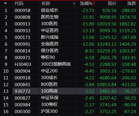 正常情況下,創(chuàng)業(yè)成長(zhǎng)指數(shù)最大跌幅是不可能超過(guò)10%的。另外,醫(yī)藥生物(000808)、300醫(yī)藥(000913)、中證醫(yī)藥(000933)、新興成指(000171)、全指醫(yī)藥(000991)5個(gè)指數(shù)今日早盤顯示跌幅也超過(guò)10%。