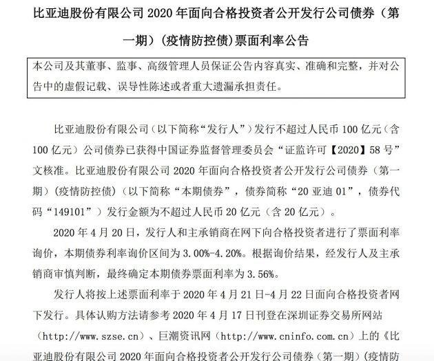 4月21日消息,比亞迪(002594)發(fā)布公告稱,2020年面向合格投資者公開(kāi)發(fā)行公司債券(第一期)票面利率最終確定為3.56%。