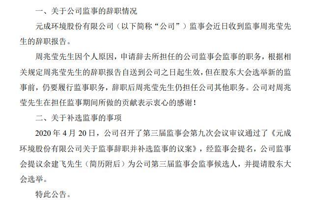 摘要: 4月21日消息,近日元成股份(603388)監(jiān)事會(huì)收到監(jiān)事周兆瑩的辭職報(bào)告。