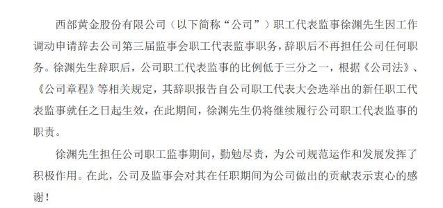 西部黃金表示徐淵擔(dān)任公司職工監(jiān)事期間,勤勉盡責(zé),為公司規(guī)范運作和發(fā)展發(fā)揮了積極作用。在此,公司及監(jiān)事會對其在任職期間為公司做出的貢獻(xiàn)表示衷心的感謝!