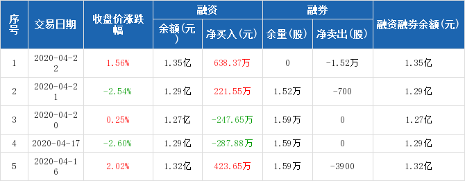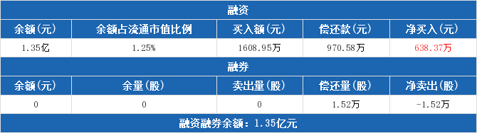 融資方面,當(dāng)日融資買入1608.95萬(wàn)元,融資償還970.58萬(wàn)元,融資凈買入638.37萬(wàn)元。融券方面,融券賣出0股,融券償還1.52萬(wàn)股,融券余量0股,融券余額0元。融資融券余額合計(jì)1.35億元。