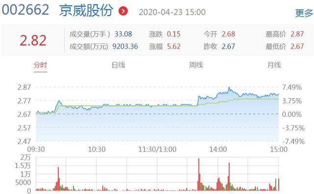 截至4月23日,京威股份當(dāng)日漲5.62%,報(bào)2.82元/股。