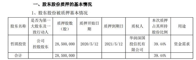 公告顯示,興瑞科技本次質(zhì)押股數(shù)2850萬(wàn)股,占其所持股份比例為39.44%,質(zhì)押日期自2020年5月12日至2021年5月12日,質(zhì)權(quán)人為華潤(rùn)深國(guó)投信托有限公司。