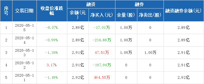 融資方面,當(dāng)日融資買入346.6萬(wàn)元,融資償還363.61萬(wàn)元,融資凈償還17.01萬(wàn)元。融券方面,融券賣出0股,融券償還0股,融券余量1萬(wàn)股,融券余額27.98萬(wàn)元。融資融券余額合計(jì)2.89億元。