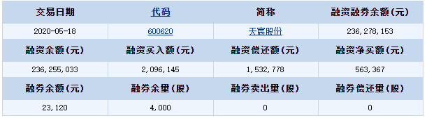 天宸股份(600620)2020-05-18融資融券信息顯示,天宸股份融資余額236,255,033元,融券余額23,120元,融資買入額2,096,145元,融資償還額1,532,778元,融資凈買額563,367元,融券余量4,000股,融券賣出量0股,融券償還量0股,融資融券余額236,278,153元。天宸股份融資融券詳細信息如下表:
