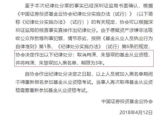 德賦資產(chǎn)兩名高管同樣被協(xié)會(huì)拉黑。法定代表人肖瀟、合規(guī)風(fēng)控負(fù)責(zé)人朱慧珉的基金從業(yè)資格被取消,并將二人加入黑名單,期限為3年。