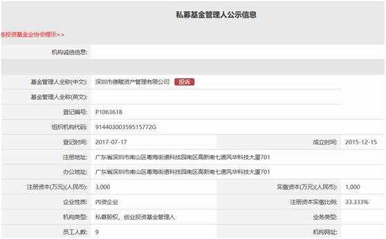 基金業(yè)協(xié)會(huì)備案信息顯示,德賦資產(chǎn)成立于2015年12月,注冊(cè)資本3000萬(wàn),實(shí)繳1000萬(wàn),備案產(chǎn)品只有1只。