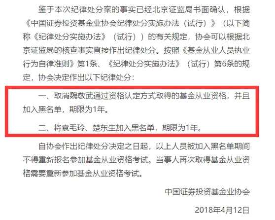 按照協(xié)會(huì)公告,取消公司總經(jīng)理魏敬武的基金從業(yè)資格,并加入黑名單,期限為1年。實(shí)際控制人袁毛玲、法定代表人楚東生也被加入黑名單,期限為1年。之所以沒有取消基金從業(yè)資格,是因?yàn)檫@兩位高管并沒有基金從業(yè)資格……