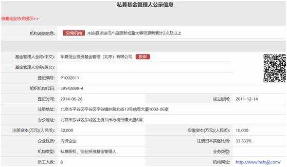 根據(jù)基金業(yè)協(xié)會(huì)備案信息顯示,該公司員工有8人,注冊(cè)資本3億元,實(shí)繳資本1億元,顯示為“未按要求進(jìn)行產(chǎn)品更新或重大事項(xiàng)更新累計(jì)2次及以上”的異常機(jī)構(gòu)。