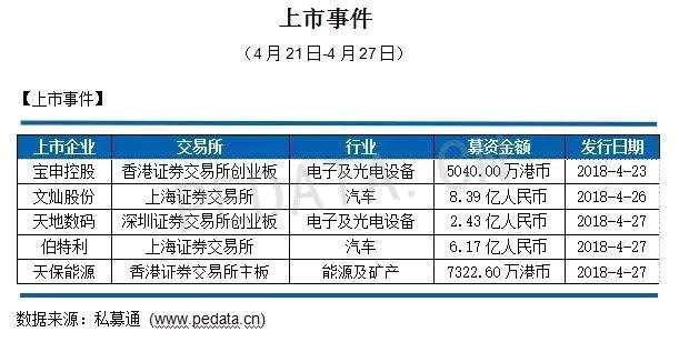 本周融資金額較大的的上市事件為2018年4月26日,廣東文燦壓鑄股份有限公司在上海證券交易所上市,發(fā)行股數(shù)0.55億股,每股發(fā)行價(jià)格為15.26元,共募集資金金額8.39億人民幣。文燦股份(603348)(603348)成立于1998年,公司主要從事汽車鋁合金精密壓鑄件的研發(fā)、生產(chǎn)和銷售,產(chǎn)品主要應(yīng)用于中高檔汽車的發(fā)動(dòng)機(jī)系統(tǒng)、變速箱系統(tǒng)、底盤系統(tǒng)、制動(dòng)系統(tǒng)、車身結(jié)構(gòu)件及其他汽車零部件。本次公開發(fā)行股票募集資金擬用于新建生產(chǎn)廠房、設(shè)備及配套設(shè)施,用于生產(chǎn)汽車變速箱壓鑄件等。