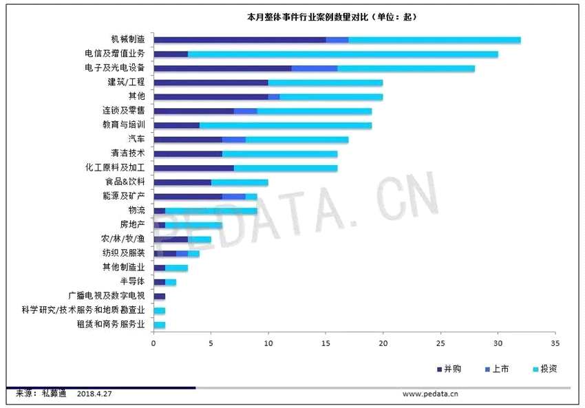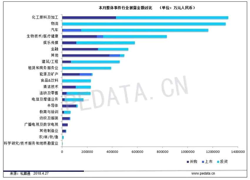 截止本周五下午,投資、上市和并購共177起事件,涉及總金額631.87億元人民幣。從交易金額來看,涉及投資金額較大的事件是2018年4月24日,國新基金管理有限公司、軟銀愿景基金、CapitalG、法拉龍資本管理公司、Baillie Gifford& Co等投資滿幫集團(tuán)19億美元。
