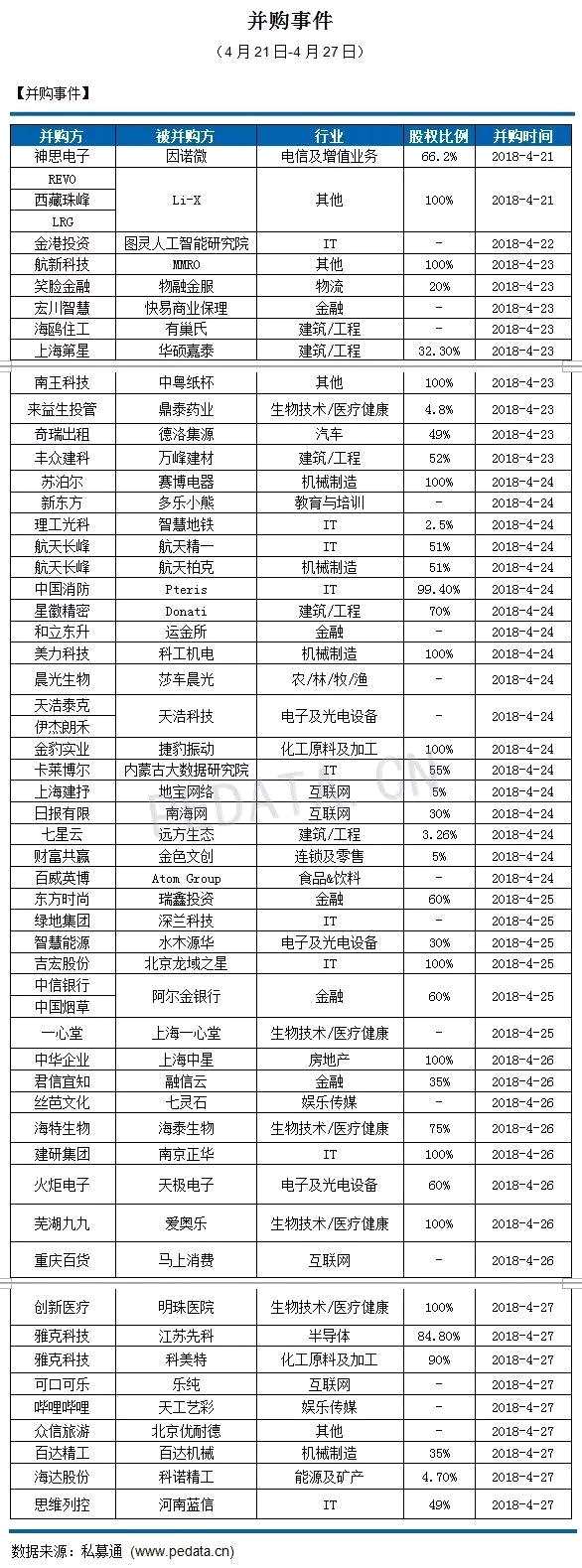 從并購事件交易數(shù)量來看,本周IT發(fā)生了9起并購事件,本周并購金額較大的并購事件2018年4月26日,中華企業(yè)(600675) (600675)股份有限公司成功受讓上海地產(chǎn)(集團(tuán))有限公司持有的上海中星(集團(tuán))有限公司100%股權(quán),作價(jià)174.72億人民幣。此次交易完成后中星集團(tuán)將成為中華企業(yè)的全資子公司。中星集團(tuán)是一家具有一級(jí)房地產(chǎn)開發(fā)資質(zhì)綜合性國有企業(yè)。中華企業(yè)是一家從事房地產(chǎn)業(yè)務(wù)的上市企業(yè)。本次資產(chǎn)重組是中華企業(yè)推進(jìn)市場化房地產(chǎn)開發(fā)業(yè)務(wù)的重要戰(zhàn)略部署。因中星集團(tuán)經(jīng)營模式和企業(yè)內(nèi)部運(yùn)營管理體系等方面存在的差異將為日后整合帶來一定難度。