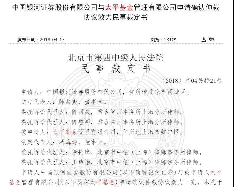 銀河證券曾在3月21日發(fā)布了一條涉及仲裁的公告稱,2018年1月19日太平基金向上海國際經(jīng)濟(jì)貿(mào)易仲裁委員會提請仲裁,請求公司償還四筆回購交易項下融資款共計人民幣1.44億元,償還融資利息共計人民幣39.8萬元,并自四筆回購交易到期結(jié)算日起分別按日計算償付補(bǔ)息及罰息。