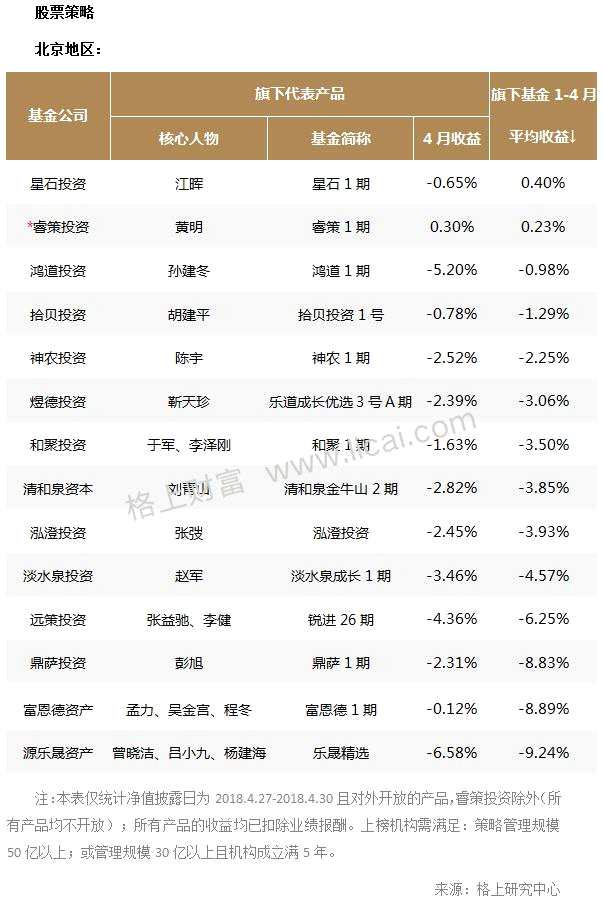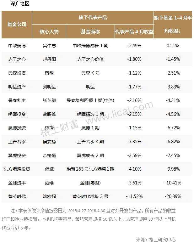 深廣地區(qū)12家大型私募中,僅有中歐瑞博一家取得了正收益,但收益也不足1%。不過,深廣地區(qū)的菁英時(shí)代的代表性產(chǎn)品虧損幅度高達(dá)20.89%。記者了解到,菁英時(shí)代投資主要聚焦大消費(fèi)、大服務(wù)、新興產(chǎn)業(yè)等領(lǐng)域,董事長兼總裁陳宏超也是業(yè)內(nèi)資深投資人士。根據(jù)公開資料,以陳宏超為核心的投研團(tuán)隊(duì),在上一輪牛市中獲得了20倍以上的收益,在08年以來的熊市中也憑借對(duì)大勢的精確把握,業(yè)績大幅領(lǐng)先大盤,擅長在熊市中逆襲。然而,在前4個(gè)月的震蕩中,這家公司業(yè)績一直在走下坡路。