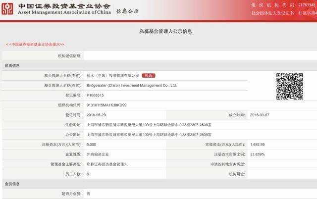 登記的私募管理人為“橋水(中國)投資管理有限公司” (下稱“橋水中國”)。橋水(中國)于2016年3月設(shè)立,2017年3月其法定代表人由橋水基金創(chuàng)始人瑞.達(dá)利奧變更為王巖(音譯)。2018年3月橋水(中國)將經(jīng)營范圍變?yōu)椤巴顿Y管理”,為申請私募管理人資格做好準(zhǔn)備。