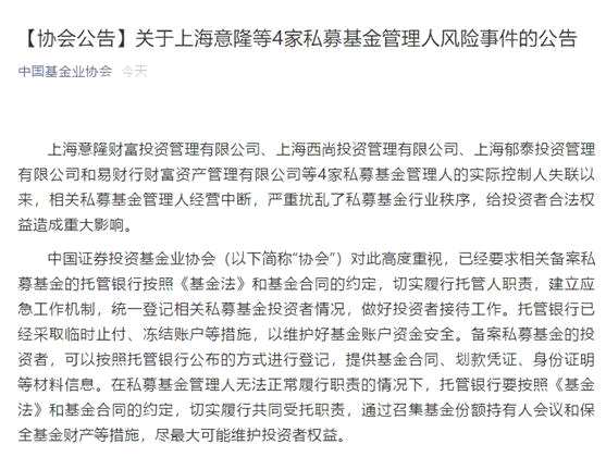 協(xié)會(huì)稱,上海意隆財(cái)富投資管理有限公司、上海西尚投資管理有限公司、上海郁泰投資管理有限公司和易財(cái)行財(cái)富資產(chǎn)管理有限公司等4家私募基金管理人的實(shí)際控制人失聯(lián)以來(lái),相關(guān)私募基金管理人經(jīng)營(yíng)中斷,嚴(yán)重?cái)_亂了私募基金行業(yè)秩序,給投資者合法權(quán)益造成重大影響。