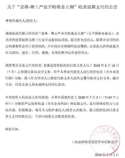 基金君從意隆財(cái)富的官方微信獲悉,該公司在一周前發(fā)布《關(guān)于“意隆-稀土產(chǎn)業(yè)并購(gòu)基金五期”收益延期支付的公告》。