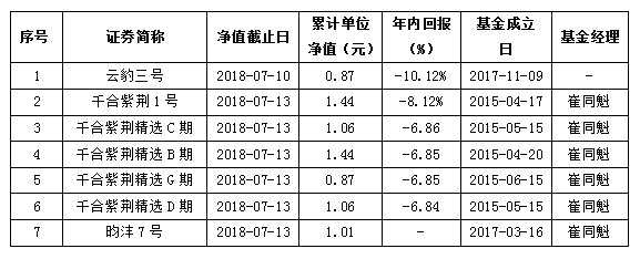 值得說明的是,雖然由崔同魁管理的昀灃7號成立于2017年初,但由于其2018年前三個月并沒有公布凈值,所以無從知曉2018年內(nèi)凈值表現(xiàn)情況。但從2017年10月20日,其累計單位凈值1.26元,而到2018年7月13日累計單位凈值降至1.01元來看,其年內(nèi)要想實現(xiàn)盈利也絕非易事。