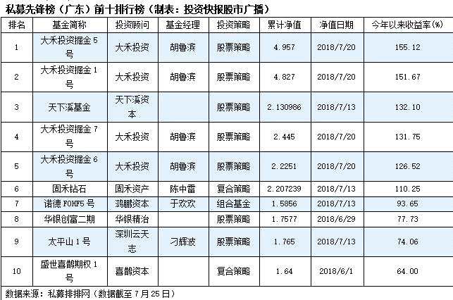 從投資快報股市廣播主辦的私募先鋒榜(廣東)前十名來看,七只股票策略產(chǎn)品挺進前十,強勢包攬前三甲。兩只復合策略產(chǎn)品、一只組合基金策略產(chǎn)品成功入圍前十。具體來看,大禾投資胡魯濱管理的產(chǎn)品業(yè)績回報極為靚麗,收益率均超過100%,其中有兩只產(chǎn)品成功包攬了第一、二名;而天下溪資本旗下產(chǎn)品“天下溪基金”則以132.1%的收益率一舉奪得私募先鋒榜(廣東)第三名。