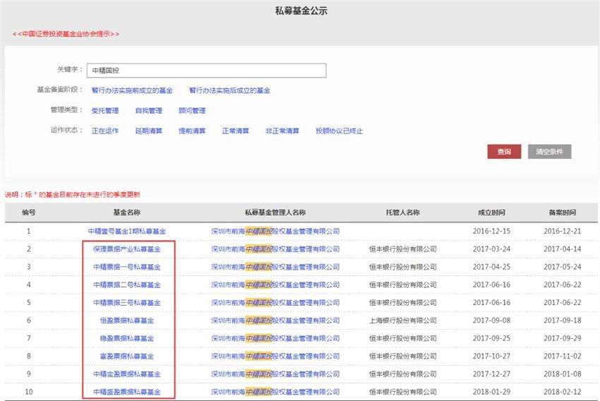 先來(lái)看一下這家私募機(jī)構(gòu),中國(guó)基金業(yè)協(xié)會(huì)官網(wǎng)顯示,深圳前海中精國(guó)投股權(quán)基金成立于2015年8月27日,登記時(shí)間為同年11月12日,類別為其他私募投資基金管理人,備案產(chǎn)品合計(jì)10只。其中,除了中精壹號(hào)基金1期清盤外,其余9只分別為:穩(wěn)贏票據(jù)私募基金、富盈票據(jù)私募基金、中精寶盈票據(jù)私募基金、中精盛盈票據(jù)私募基金、中精票據(jù)二號(hào)私募基金、恒盈票據(jù)私募基金、中精票據(jù)一號(hào)私募基金、中精票據(jù)三號(hào)私募基金和保理票據(jù)產(chǎn)業(yè)私募基金共計(jì)9只票據(jù)類私募產(chǎn)品,其備案狀態(tài)為運(yùn)作狀態(tài)。