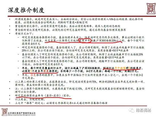 在百度文庫中,有一套源樂晟研究體系的PPT,疑似內部員工流出。該文檔上傳于2012年11月。里面詳盡的價紹了源樂晟的投資方法、考核方法。其中有一張PPT,其在11年的深度推介制度,透露出源樂晟的底色。