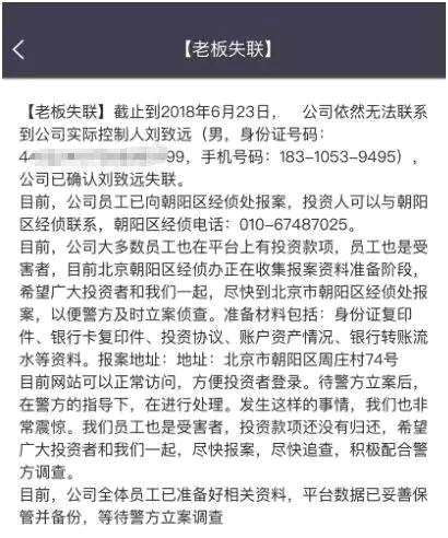 2018年6月15日,劉致遠(yuǎn)在群里突然宣布, “今天股災(zāi),風(fēng)控失效,導(dǎo)致大面積補(bǔ)倉,系統(tǒng)資金流更加雪上加霜,現(xiàn)決定所有產(chǎn)品即日起全部清盤,6月22日之前陸續(xù)返回每個賬戶投資本金和對應(yīng)賬戶部分累計(jì)收益?!?月19日便徹底失蹤。