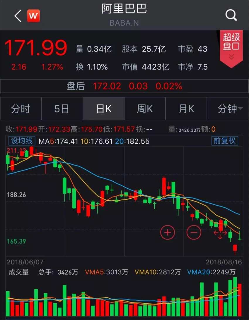 阿里巴巴股價(jià)走勢(shì)圖顯示,阿里巴巴自6月中旬股價(jià)開(kāi)始走路下坡路,從211美元左右跌至目前171.99美元。