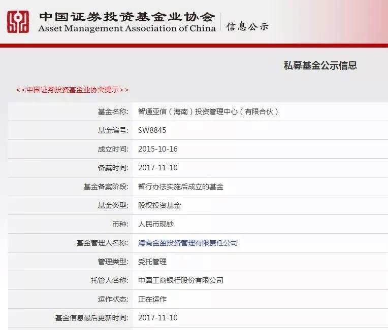 海南金盈目前在基金業(yè)協(xié)會(huì)備案有一只產(chǎn)品,即智通亞信(海南)投資管理中心(有限合伙),備案時(shí)間為2017年11月10日,基金類型為股權(quán)投資基金。