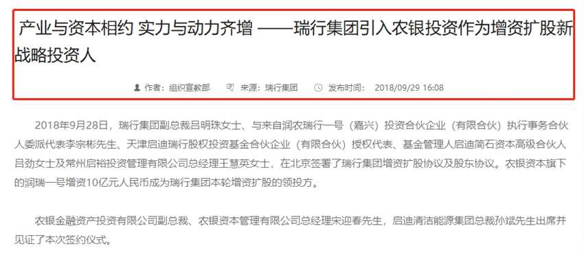 值得注意的是,潤農(nóng)瑞行一號基金在今年9月28日簽署了對西安瑞行城市熱力發(fā)展集團(tuán)有限公司增資10億元的協(xié)議,是該集團(tuán)本輪增資擴(kuò)股的領(lǐng)投方。