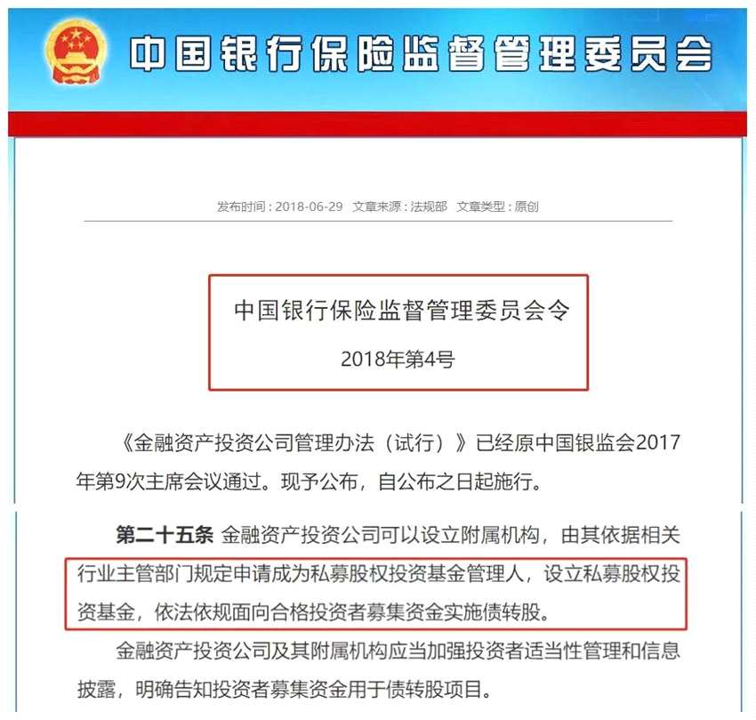 今年6月,銀保監(jiān)會發(fā)布的《金融資產(chǎn)投資公司管理辦法(試行)》,第二十五條明確指出,金融資產(chǎn)投資公司可以設(shè)立附屬機(jī)構(gòu),由其依據(jù)相關(guān)行業(yè)主管部門規(guī)定申請成為私募股權(quán)投資基金管理人,設(shè)立私募股權(quán)投資基金,依法依規(guī)面向合格投資者募集資金實(shí)施債轉(zhuǎn)股。